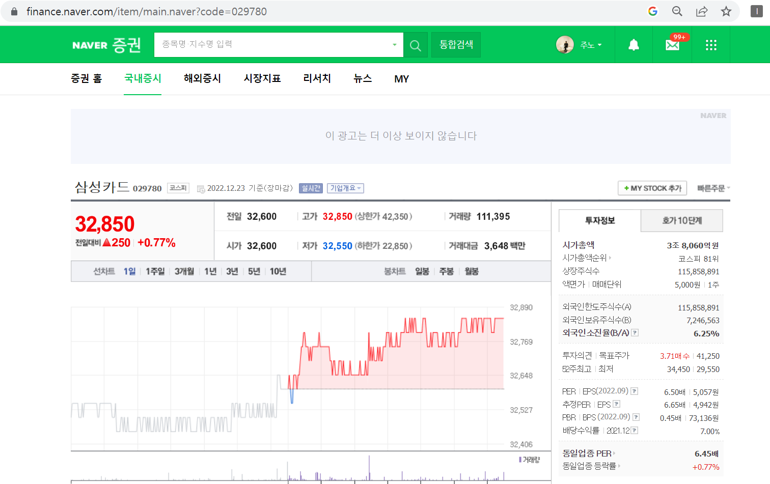 네이버 금융 홈페이지에서 삼성카드(029780) 검색해서 페이지를 들어가서 삼성카드 주식을 조회할 수 있다.