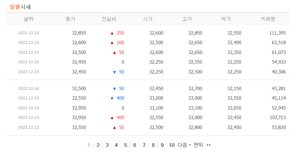 네이버 금융 일별시세 페이지는 주가가 1페이지당 10개씩 볼 수 있다.