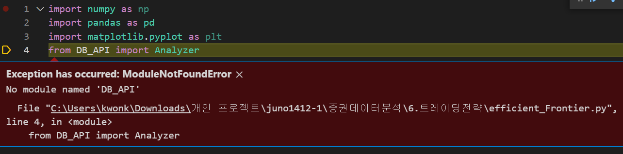 python 코드로 증권데이터분석 코딩을 하다가 내가만든 python 파일 모듈을 import 하지못하는 에러가 발생했다.
