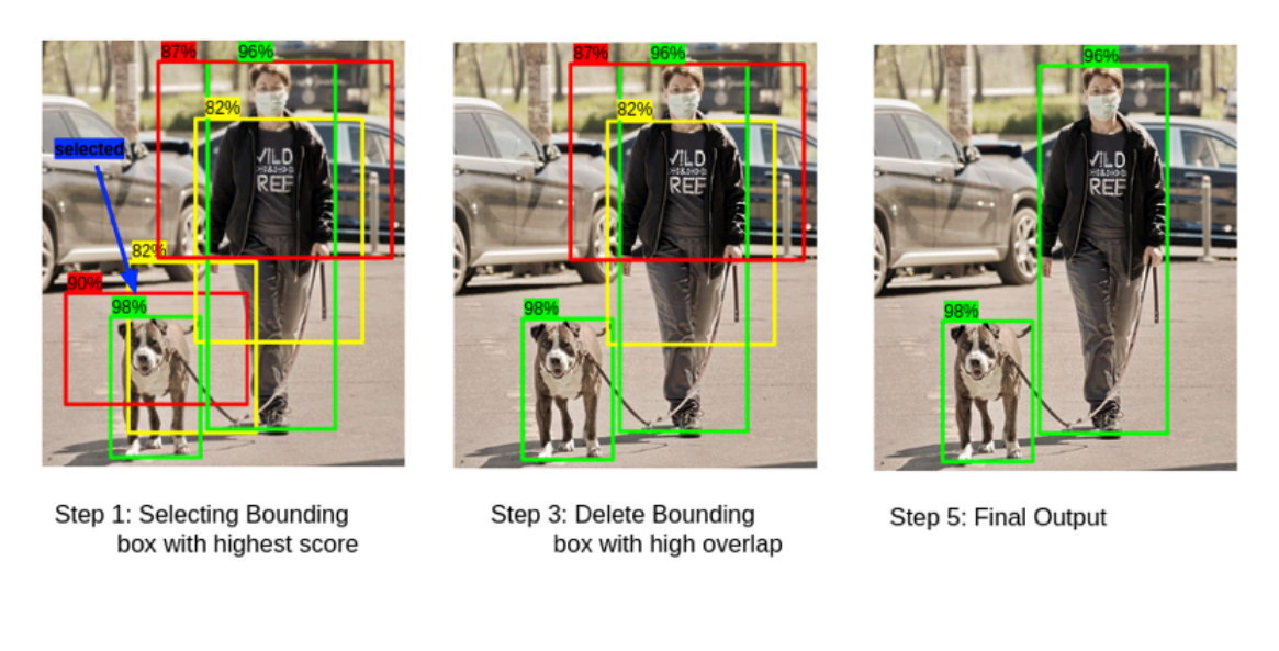 번역하면 NMS는 객체 감지 알고리즘의 마지막 단계이며, 객체에 가장 Bounding-Box를 찾는 데 사용된다.