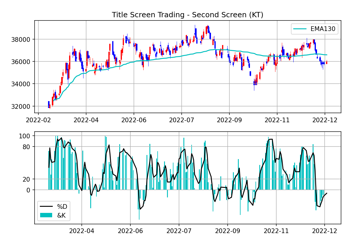 주간 히스토그램보다 130일 지수 이동평균선의 신뢰성이 높아서, 130일 지수 이동평균과 스토캐스틱을 사용해서 두번째 창 - 시장파도를 python을 구현한다.