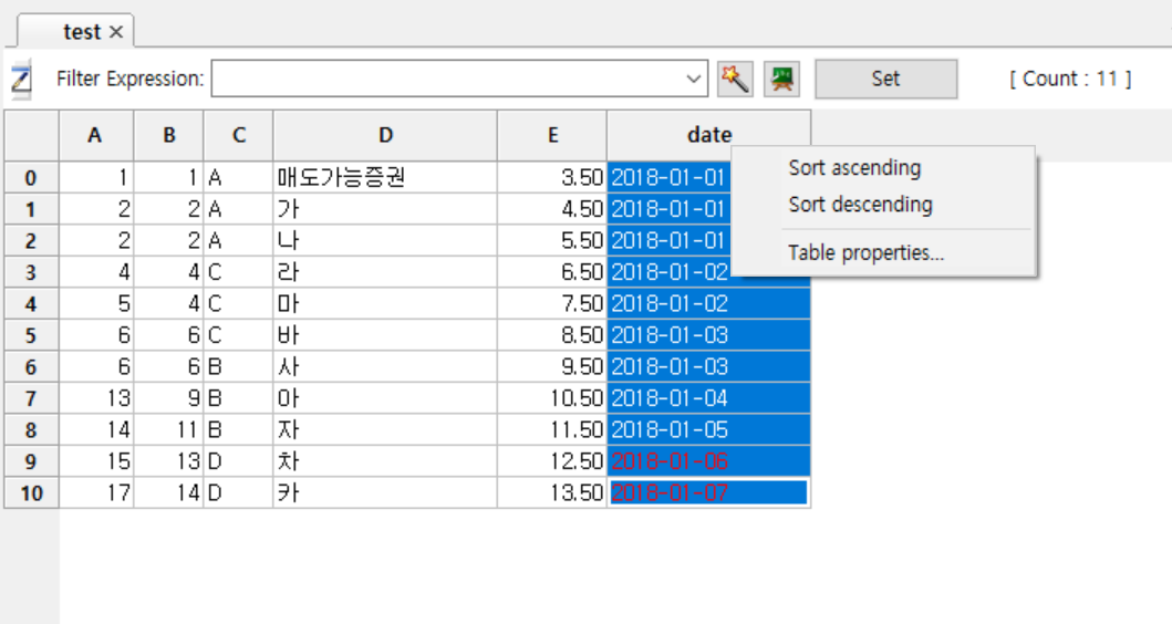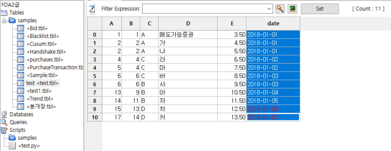 test.tbl 테이블의 date 칼럼에 데이터 칼럼을 선택한다.