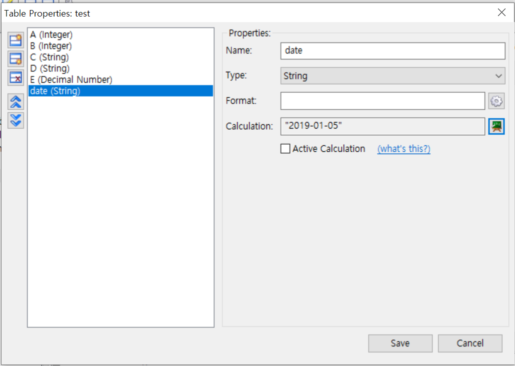 날짤 컬럼의 Type : String, Calculation : "2019-01-05"를 입력한다.