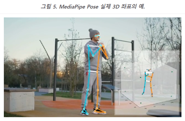 - x, y, z 좌표 값 : 실제 3D 좌표를 엉덩이를 중심점으로 0.0 ~ 1.0 사이값으로 정규화된 랜드마크 좌표