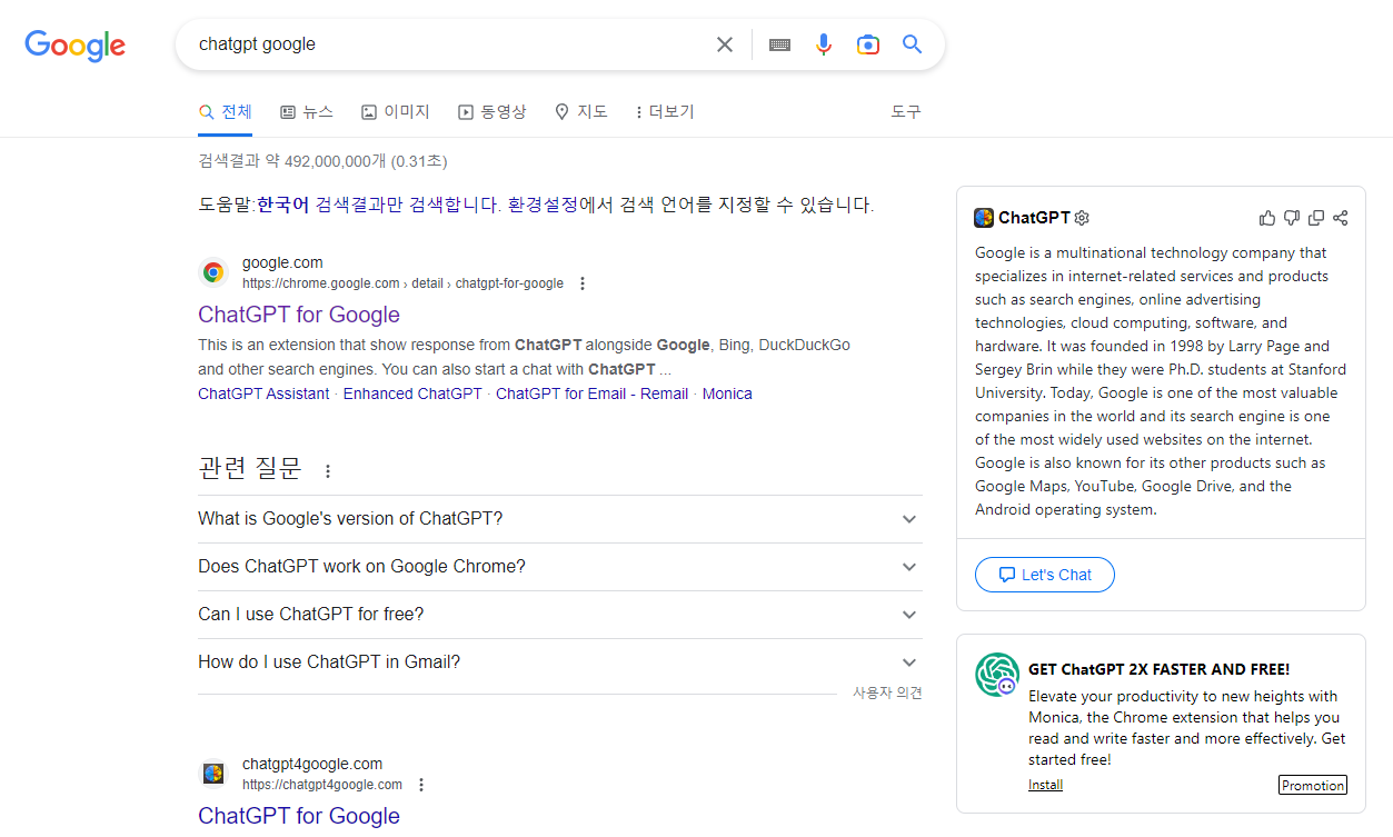 구글에 아무런 검색어나 다 입력하면 구글 검색창 옆에 ChatGPT 창이 뜨면서 검색어에 대한 대답을 해줍니다.