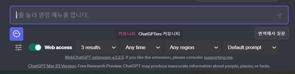 WebChatGPT를 이용해서 최신 Web정보를 이용하여 답변을 더 최신에 가까운 정보로 변형시켜 답변을 받는 게 가능해집니다.