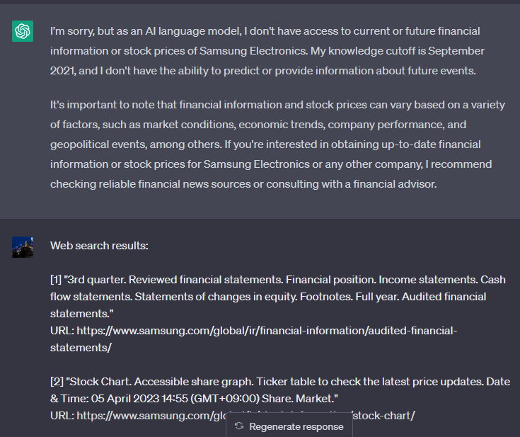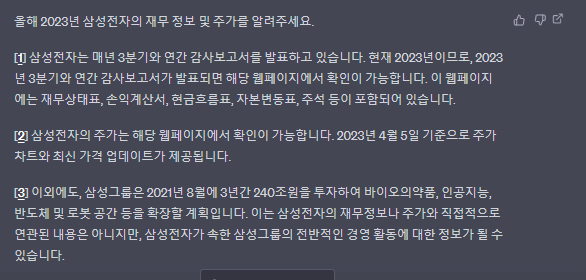 CHATGPT에게 2023년 삼성전자의 재무정보와 주가를 알려달라고 질문했어요