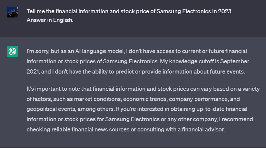 ChatGPT는 2021년까지의 정보로만 학습이 되어있기 때문에 일반적인 답변을 해주지만 2022년, 2023년에 관련된 최신 정보를 전달해주지 못한다는 장점이 있습니다.