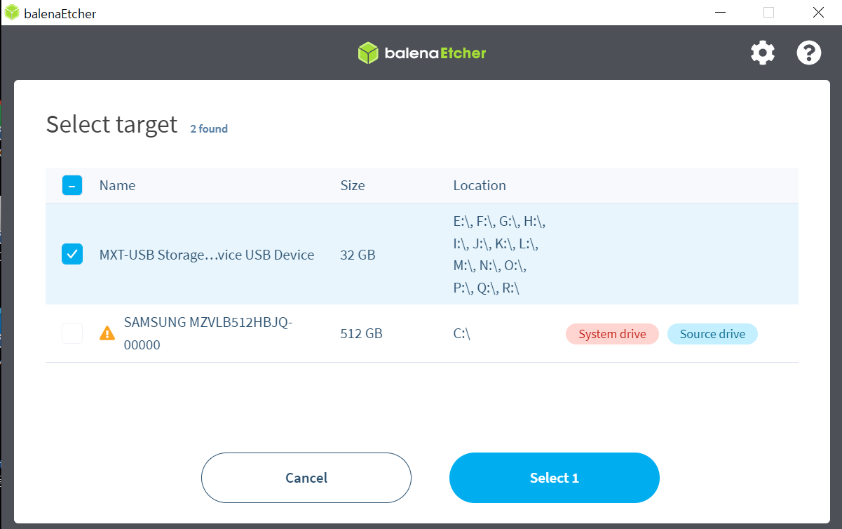 flash 시킬 usb를 설정해준 뒤 select를 누른다.