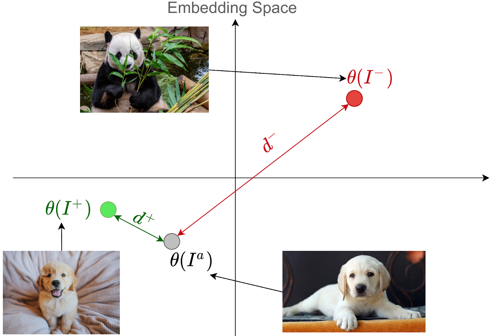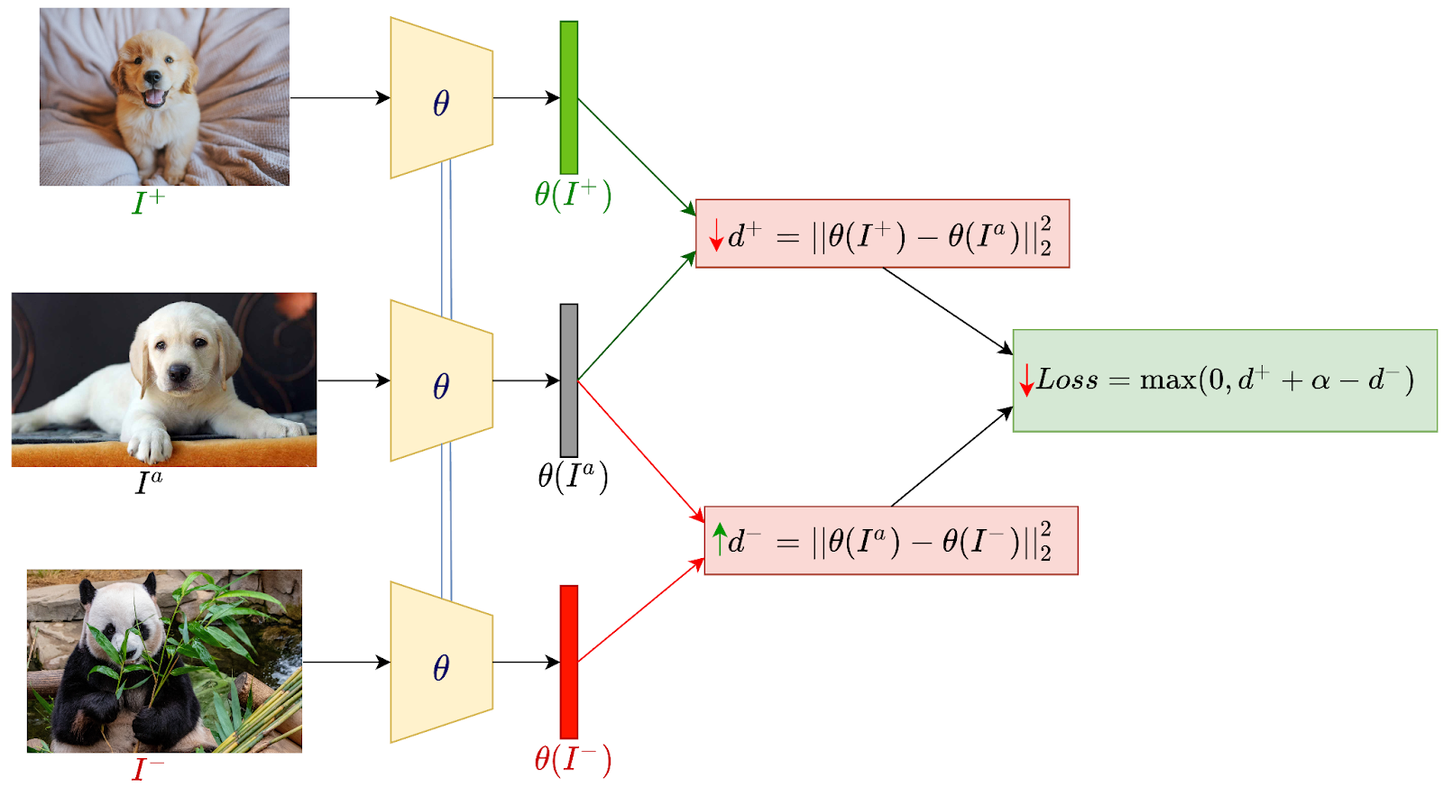 유사한 이미지(동일한 동물)은 거리가 가까워야하고, 다른 이미지(다른 동물)은 거리가 커야함을 학습한다.