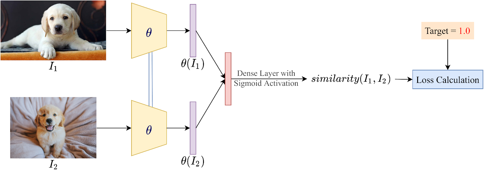 신경망을 이용해 각 image feature를 추출하고, 유클리드 거리와 같은 함수를 이용해 두 점 사이의 직선 거리를 계산합니다.