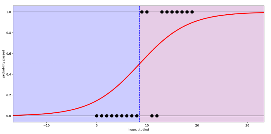 로지스틱 회귀는 참(1), 거짓(0)을 구분하는 S자 형태의 선을 그어주는 작업