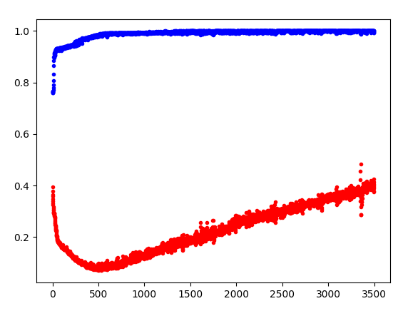 파란색선 = Y의 테스트 데이터는 계속 올라가서 1에 수렴한다. 데이터를 훈련하면 1에 가까워진다.