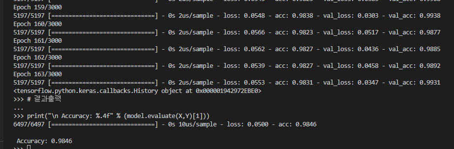 model.fit(X, Y, validation_split=0.2, epochs=3000, batch_size=500, callbacks=[early_stopping_callback])