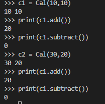 Cal 함수의 매개변수 (10, 10)이 __init__(self, v1, v2)의 v1, v2로 입력되어 10, 10의 결과값이 나온 것을 확인할 수 있다.