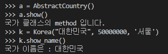 def show_capital(self)구문으로 Korea 클래스를 상속받는 abstract method를 구현한다.