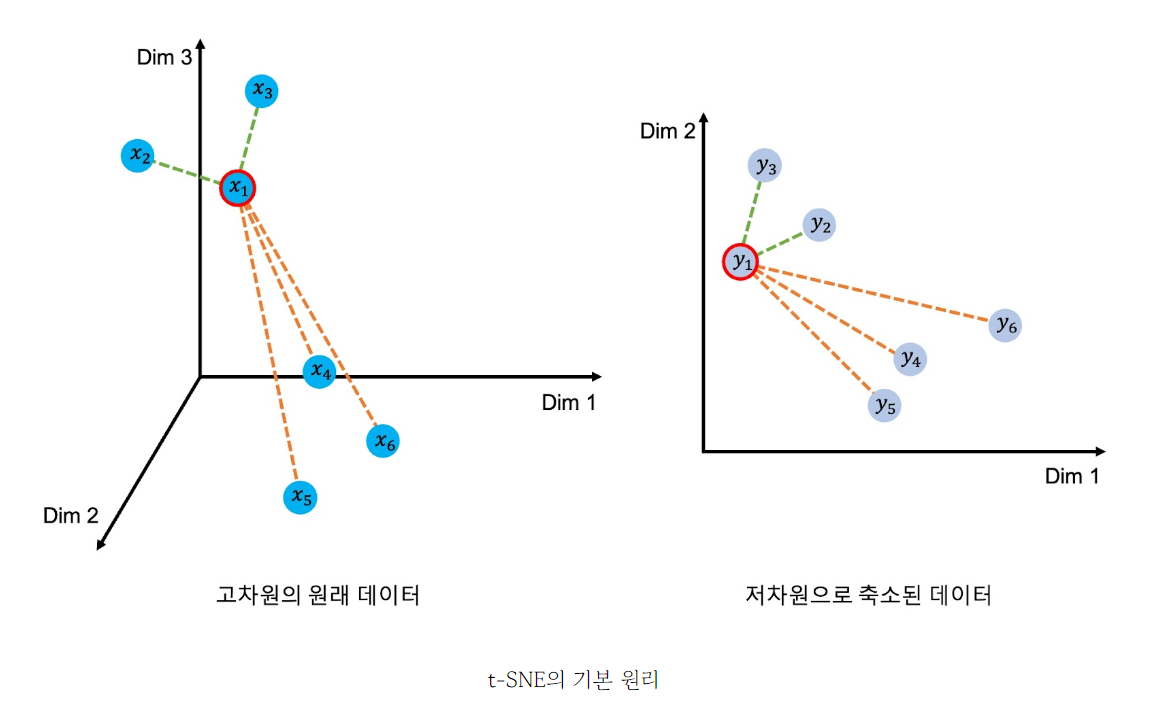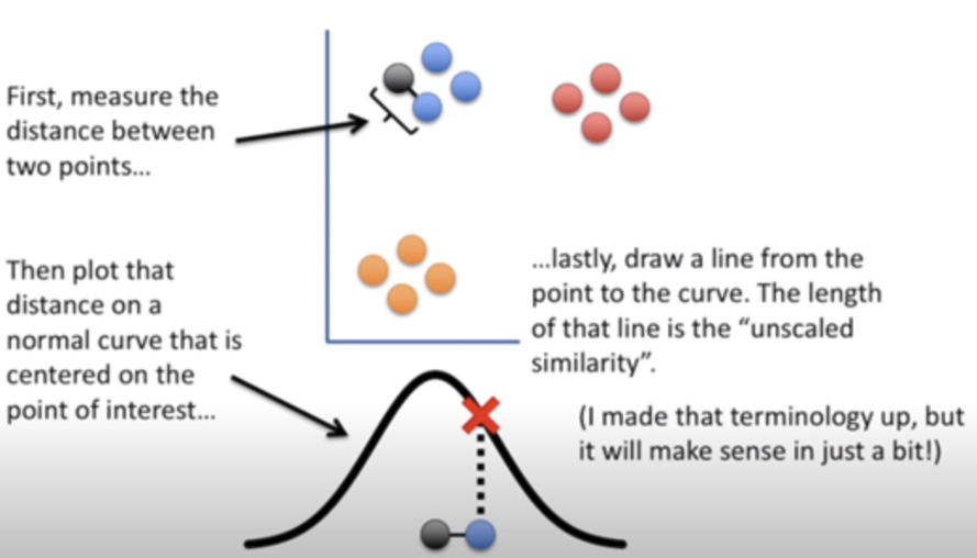 - t 분포를 이용해 하나의 기준점을 정하고 모든 다른 데이터와 거리를 구한 후 그 값에 해당하는 t 분포 값을 선택, 값이 유사한 데이터끼리 묶어줌