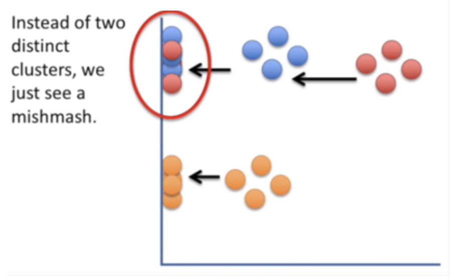 - 단점 : 선형 방식으로 정사영하면서 차원의 축소 -> 군집된 데이터들이 뭉게지는 단점