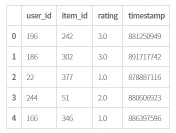 : user_id, item_id, rating, timestamp 4개 data가 담긴 dataset