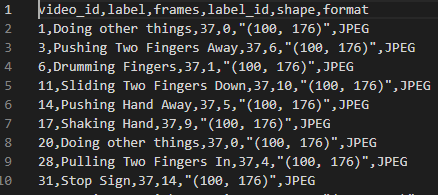 : video_id, label, frames, label_id, shape, format 6개 data가 담긴 jester