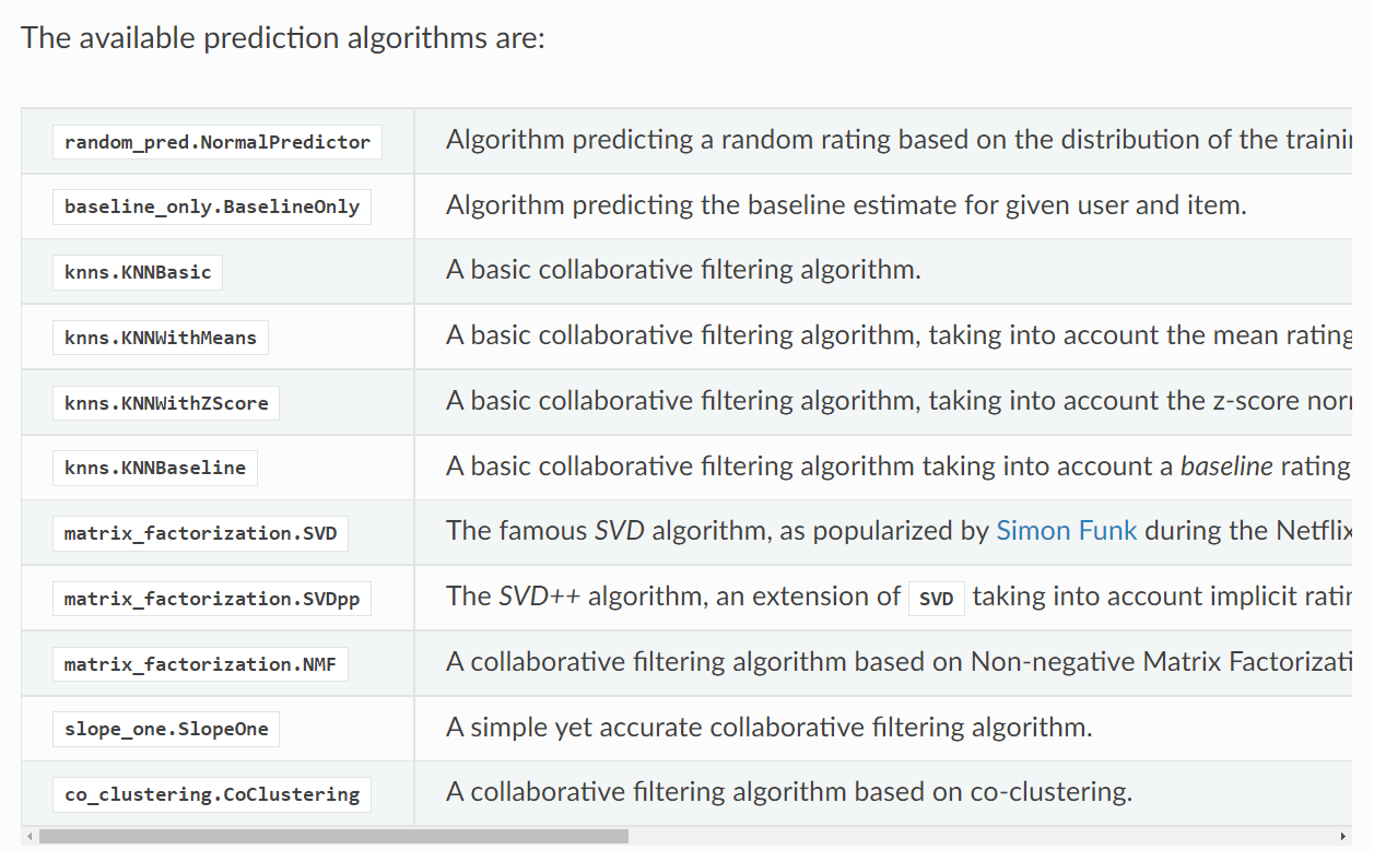 from surprise import NormalPredictor, BaselineOnly, KNNBasic, KNNWithMeans, KNNBaseline, SVD, SVDpp, NMF, SlopeOne, CoClustering