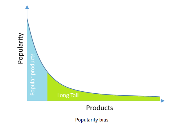신규 제품이 출시되면, 정말 양질의 제품이라고 하더라도 유저들의 조회, 평점, 리뷰가 없어 인기 없는 제품으로 판단되어 유저들에게 잘 추천되지 않는 경우가 생겨나게 됩니다. 이런 경우를 추천을 받는 아이템이 극소수 이기에 Popularity bias 또는 Long tail graph라고 합니다