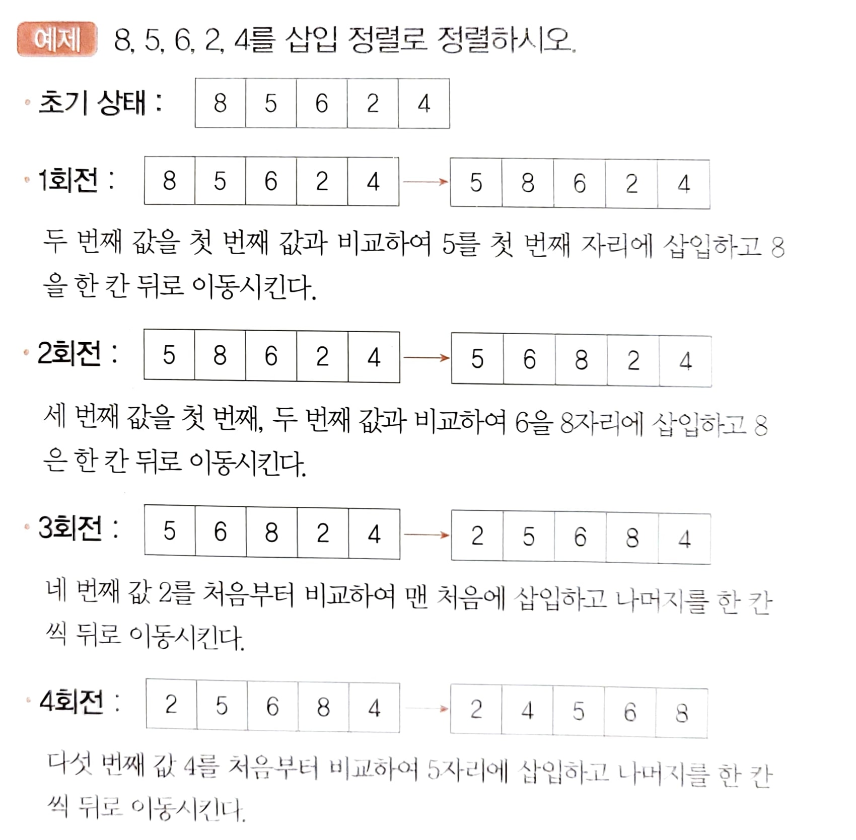 - 가장 간단한 정렬방식으로 이미 순서화된 파일에 새로운 하나의 레코드를 순서에 맞게 삽입시켜 정렬하는 방식