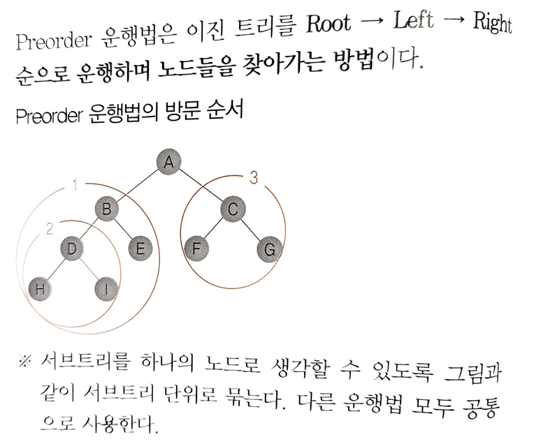- Preorder 운행법은 이진트리를 root → left → right순으로 운행하며 노드들을 찾아가는 방법