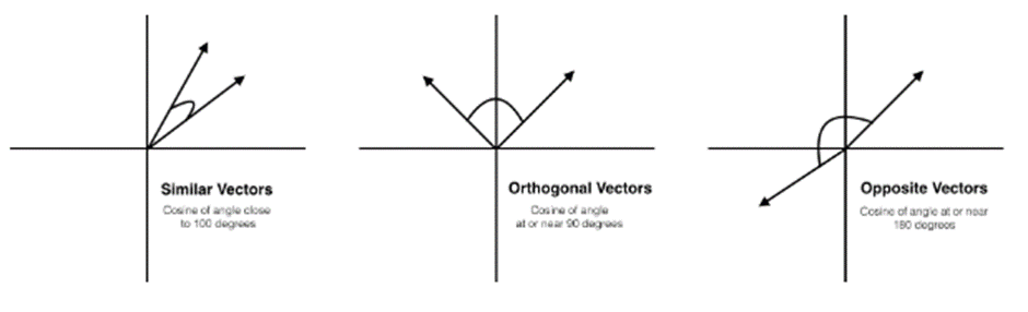 코사인 함수가 0도일 때 값은 1, 90도일 때 0, 180도일 때 -1 값을 가지는 것처럼 2가지 벡터의 각도가 작아지면 유사하다고 판단, 멀어지면 유사하지 않다고 판단한다.