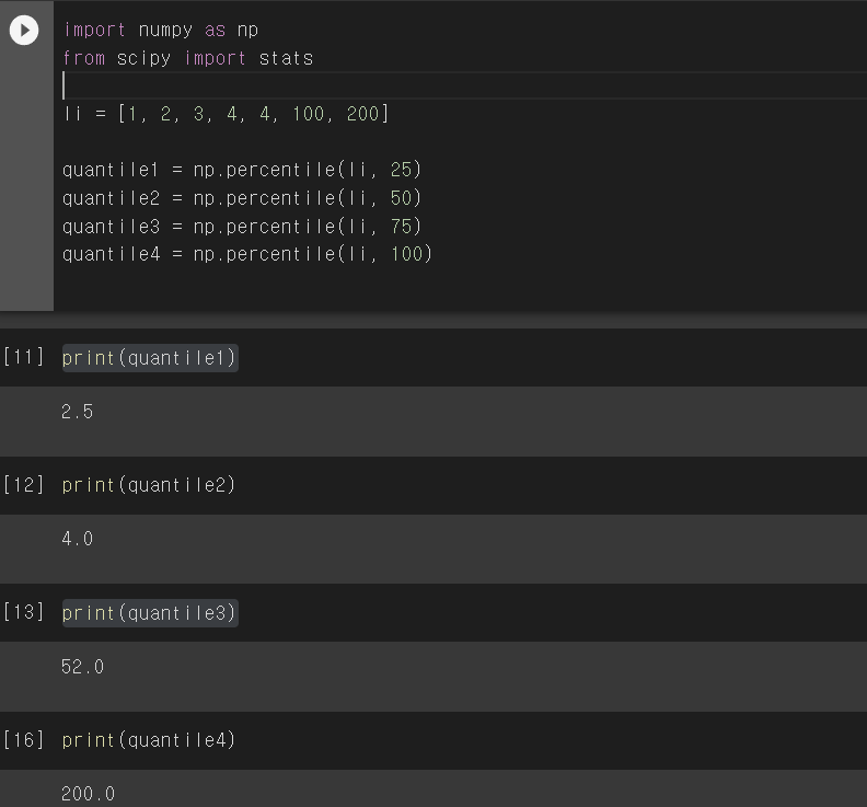 4분위수는 측정값을 낮은순에서 높은순으로 정렬한 뒤, 4분위했을 때 각 등위마다 해당하는 값을 의미한다.
