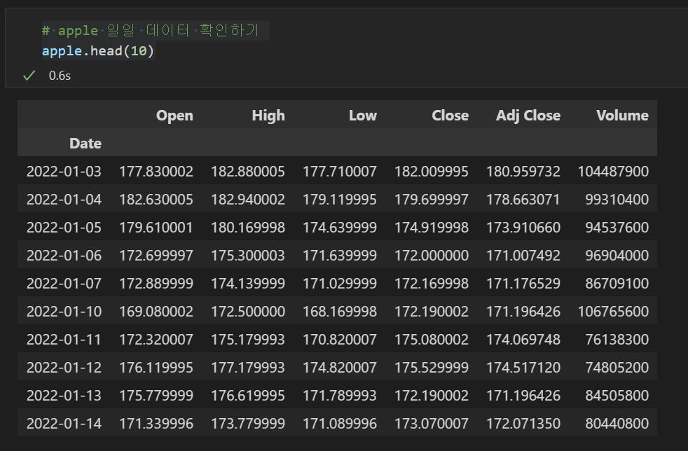 - apple 주가 확인하기 : 2022년 1월 1일부터 주가 데이터 확인이 가능하다