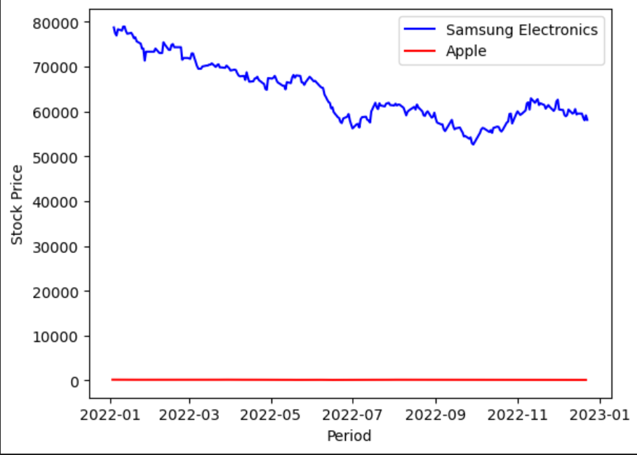 삼성전자, 애플의 종가데이터를 이용한 비교 그래프 출력