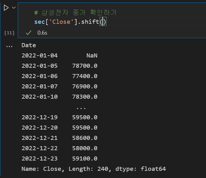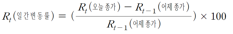 일간변동률 수식을 python 코드로 옮기는데 Series 모듈에서 제공하는 shift()함수를 사용하여 구현할 수 있다.