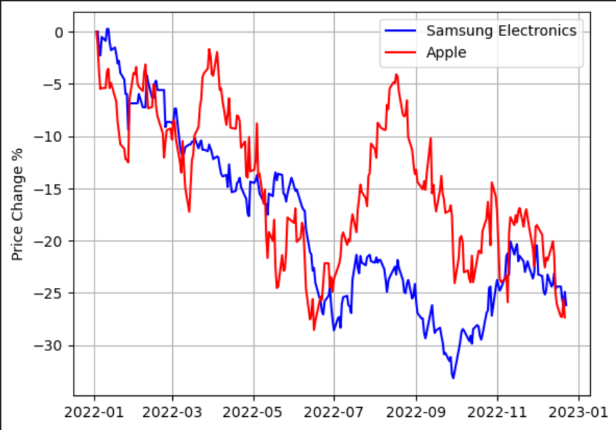 삼성전자, 애플 일간 변동률 주가 비교하기